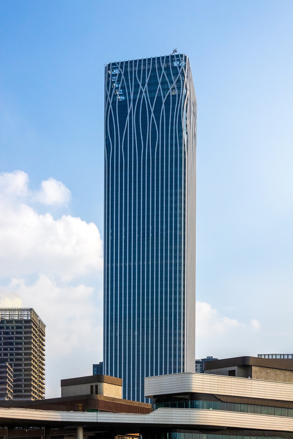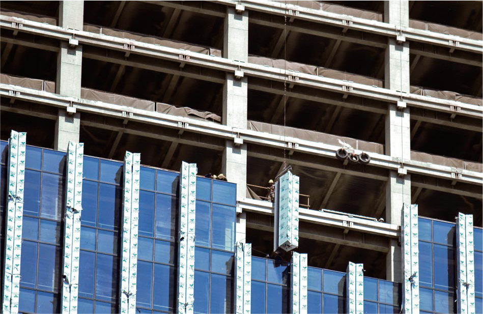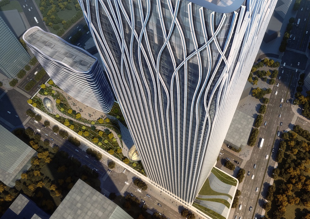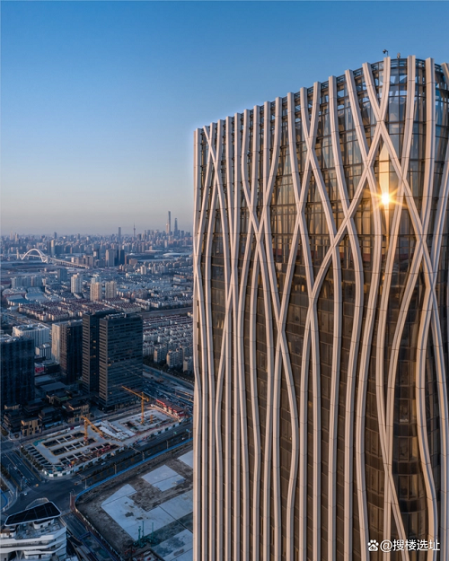 設(shè)計(jì)大師“樹(shù)”的設(shè)計(jì)理念突出體現(xiàn)在外立面幕墻。鋁幕線條從6層開(kāi)始齊頭并進(jìn)直至215米處,之后線條開(kāi)始不規(guī)則地“開(kāi)枝散葉”,使得前灘中心看起來(lái)更為靈動(dòng)、生機(jī)勃勃。