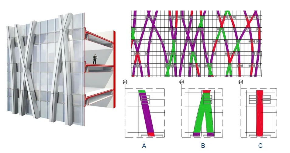 為追求水流的無(wú)序美感,塔樓頂端的鋁幕墻裝飾條均為不規(guī)則并伴有交叉的曲線。裝飾條轉(zhuǎn)角部位的鋁幕墻為工藝復(fù)雜雙曲面,項(xiàng)目中最大的一塊單元體線條,零部件數(shù)量超過(guò)100個(gè)單體,總面積達(dá)到19㎡,精度誤差要求不超過(guò)3mm,且安裝高度超過(guò)200米,制作和施工難度可想而知。
